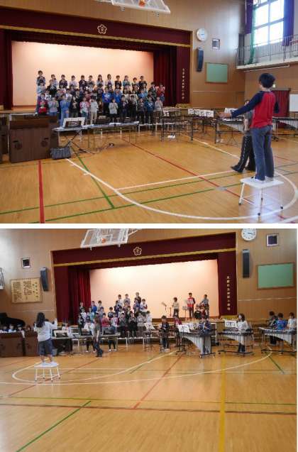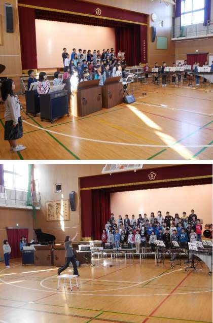 早くも5年生が講堂で音楽発表会の練習が始まりました。位置を確認して練習です。発表が楽しみですね。