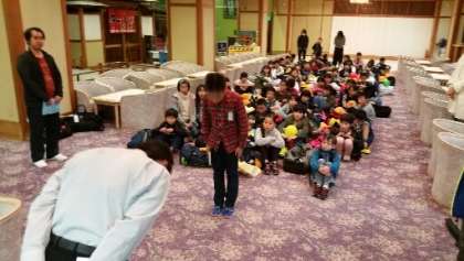 志摩ビーチホテルに到着しました。ロビーで開舎式を行い、ホテルの人に挨拶しました。これから部屋に入ります。