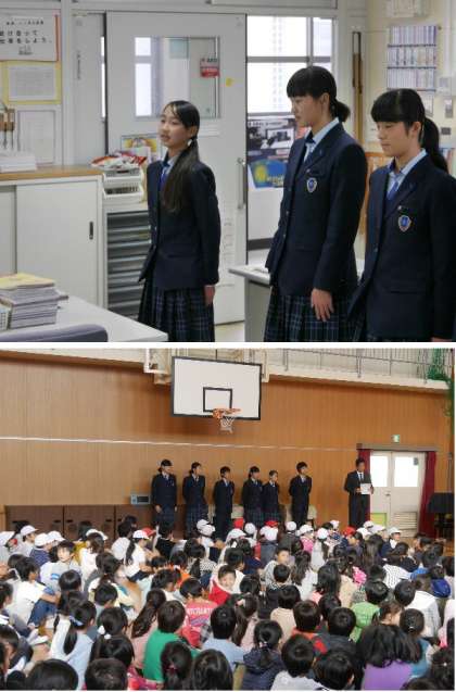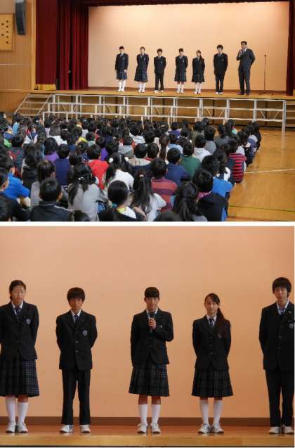 今日と明日の2日間、茨田北中学校の2年生6名が、焼野小学校で職場体験をおこないます。中学生にとっては将来のキャリアを考えるよい機会です。職員会議であいさつしたあと、全校朝会で紹介をしました。