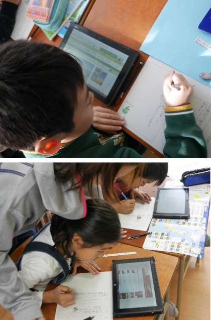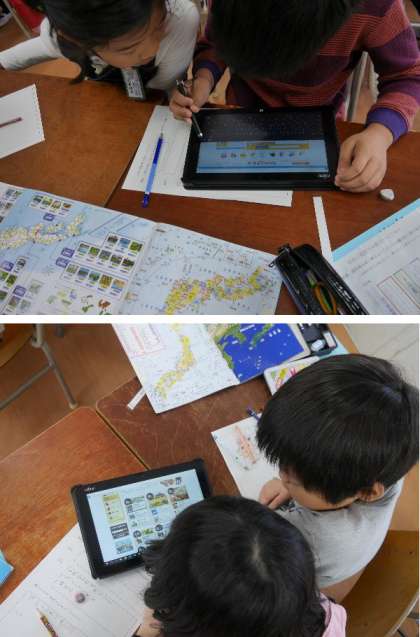 4年の国語では、都道府県のPR広告を作るために、タブレットでいろいろ調べています。便利になりました。