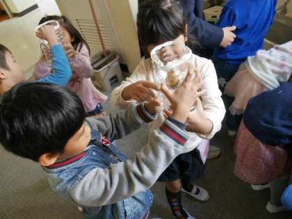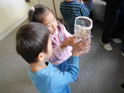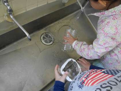 1年生がペットボトルで作った花瓶にヒアシンスの球根を植えていました。どんな花が咲くか楽しみですね。