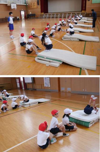 1年生がマット運動の授業をしています。少し段差をつけてうまく後ろまわりができるようにしています。