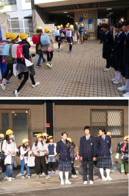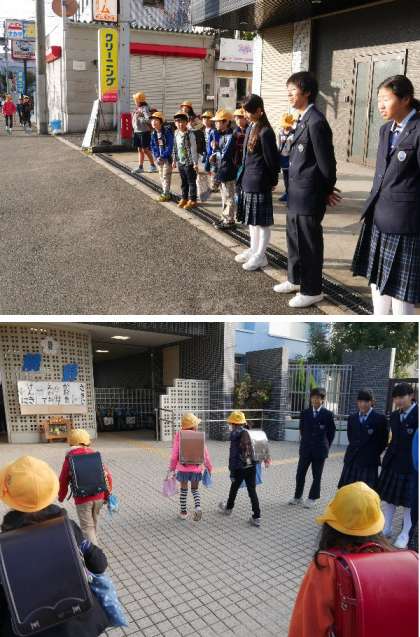 茨田北中学2年生の職場体験の2日目、朝の登校時に玄関と大通りの信号場所に分かれて子ども達の登校を見守りあいさつをしました。