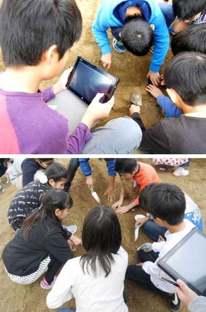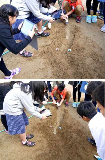 5年生の理科では「流れる水のはたらき」を学習しています。実際に地面を流れる水を観察するために、川を作って水を流して、様子をタブレットで撮影して観察しています。