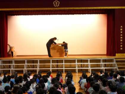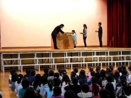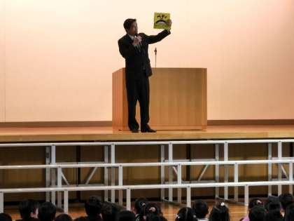 全校朝会で、土曜日にあった、「発想をつなぐ絵本バトン」と「本の帯創作コンクール」を受賞した4人に学校でも表彰いたしました。