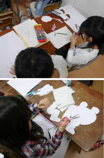3年生が画用紙を切って重ねてはりつけ、紙はんがをつくっています。細かな部分にこだわって、考えて作っています。