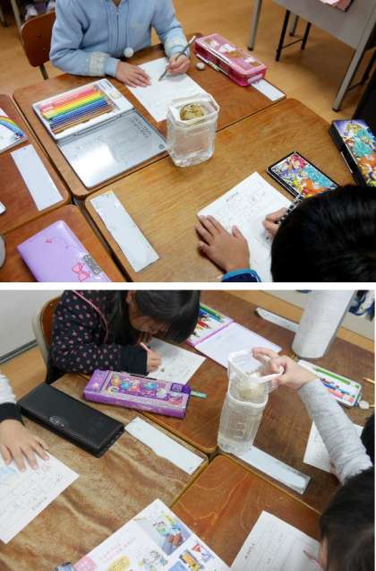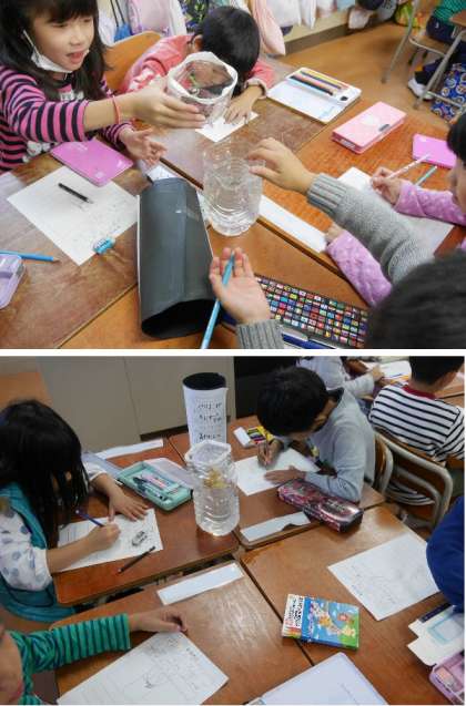 1年生では、教室でヒアシンスを育てています。定期的にヒアシンスを取り出して観察して記録しています。球根の下に根がたくさんでてきましたね。