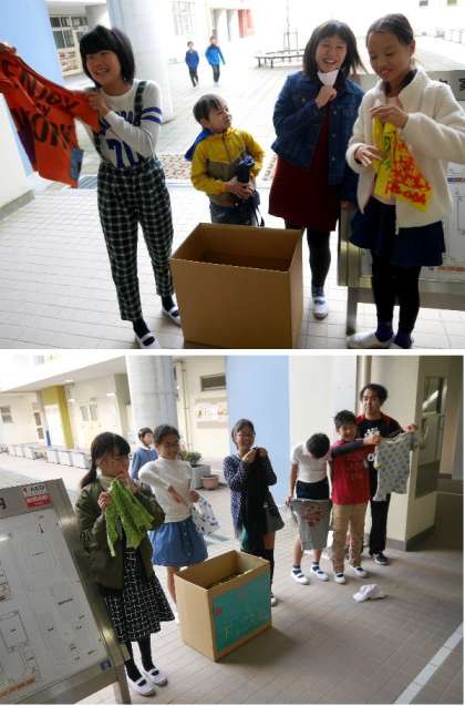 6年生がユニクロの出前授業を受けて、ボランティア活動の取り組みを始めました。いらなくなった子ども服を回収して、ユニクロを通じて世界で服を必要としている人に送ります。回収初日の今日からたくさんの服があつまりました。ありがとうございます。
