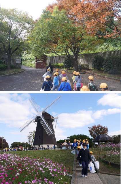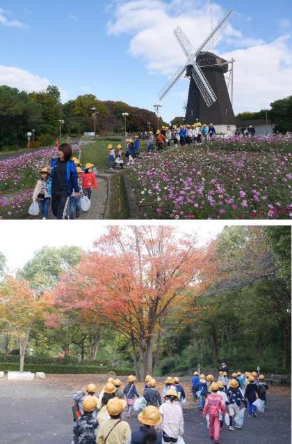 秋晴れの今日、1年生は鶴見緑地公園に秋さがしの校外学習で出かけました。焼野小は鶴見緑地が近いのでうれしいですね。管理作業員さんも玄関で見送ってくれました。風車の丘ではみごとなコスモスがとてもきれいでしたね。紅葉がとてもきれいです。