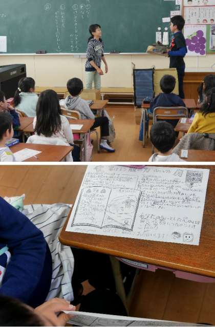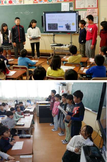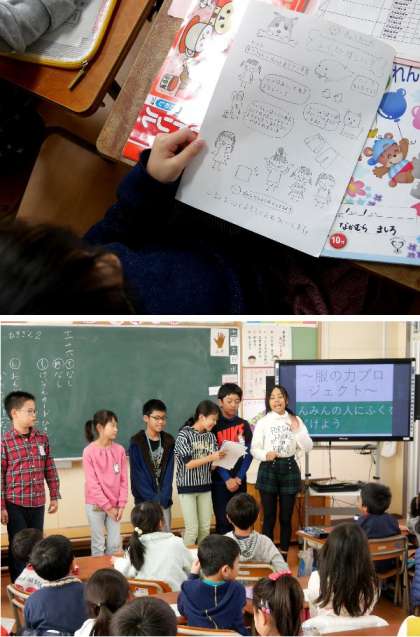 6年生が取り組んでいるボランティア活動は、1学期のユニクロの出前授業をうけたものです。世界で服がなくて困っている子どもたちに届けようとするものです。家でいらなくなった子ども服を回収して送ります。1年生の子とも達にタブレットや劇で分かりやすく説明しました。手渡しのチラシも手作りです。