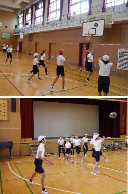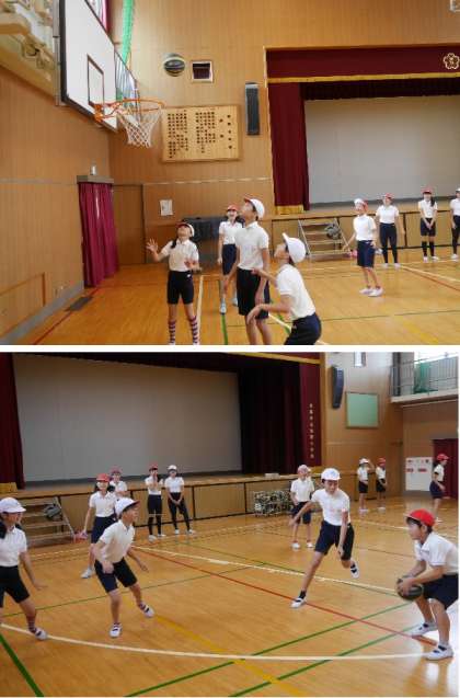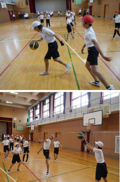6年の体育でバスケットボールを競技していました。ディフェンスの練習をしてシュートしています。