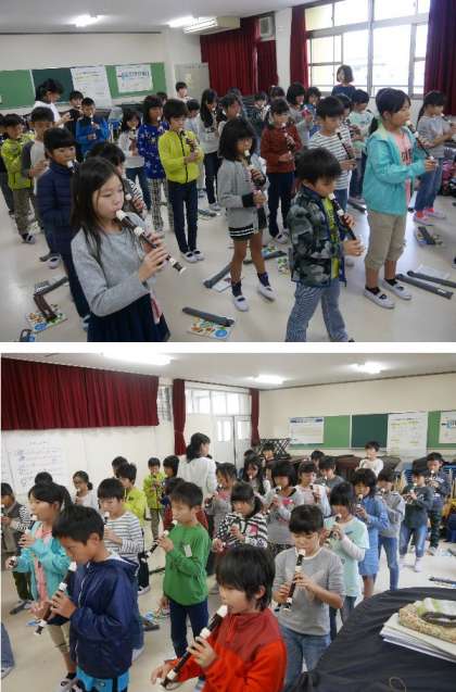 3年生が音楽でリコーダをふいています。みんなが調子をあわせていい音色が聞こえてきます。3年生から習ったリコーダを上手にふけるようになってきました。
