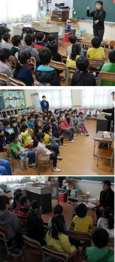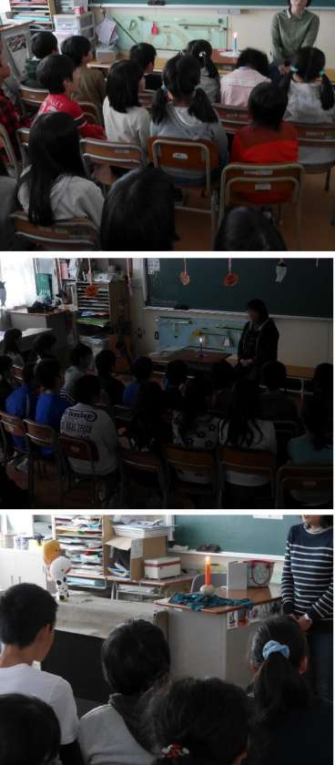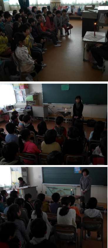 今日は、地域や鶴見図書館の方にきていただき、全学級でおはなし会をしていただきました。おはなしの世界にはいっていくように、ヘビのおともだちを紹介してくれたり、ロウソクに火をともして、ゆっくりとお話が始まっていきます。本を読むのではなく、講師の先生が覚えているおはなしが語りかけられていきます。おはなし会の雰囲気を楽しみながら聞きました。