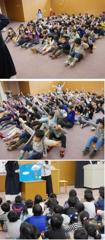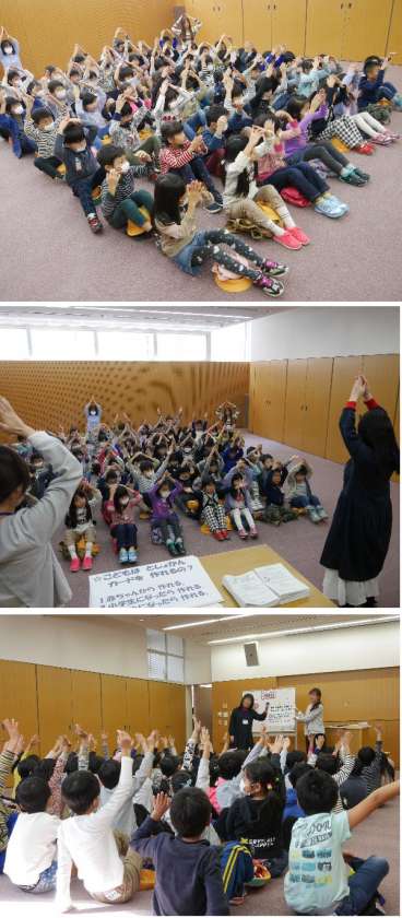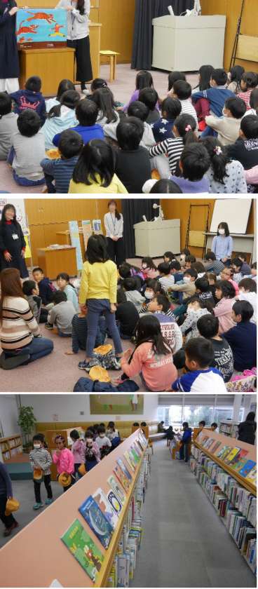 鶴見図書館の館長さんが、指あそびを教えてくれました。そして、図書館のクイズに皆で答えました。楽しい絵本を読んでもらって、最後に、皆から質問をして答えてもらいました。「本とかビデオはいくつ借りられるの?」と質問をすると丁寧に答えていただきました。図書カードは赤ちゃんから作られて、一人15冊も借りられるんですね。