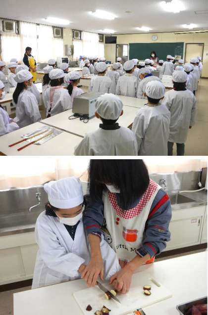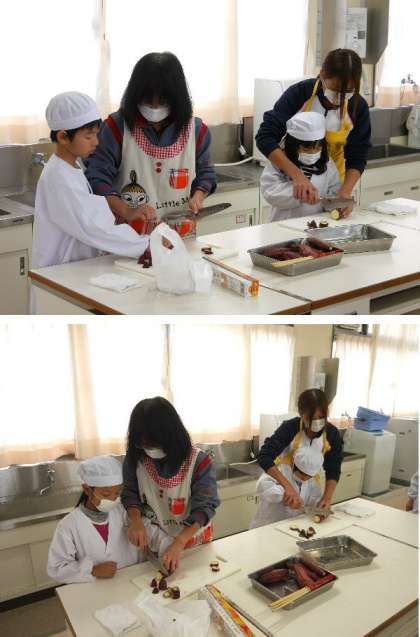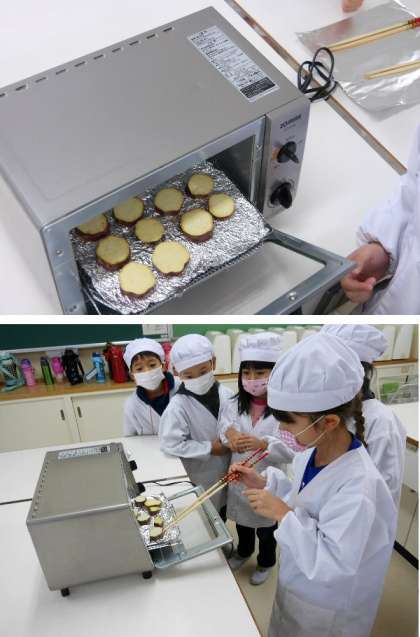 秋に2年生が収穫したサツマイモの絵を描いてきましたが、今日は調理をして試食会です。家庭科室で包丁でサツマイモを輪切りしました。そしてオーブンで焼き上げます。途中で裏返しておいしく焼けました。