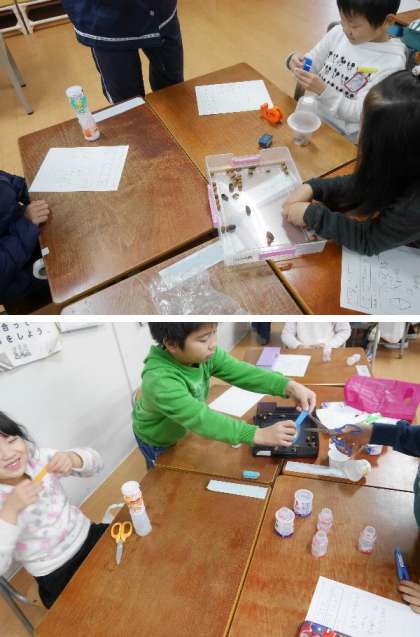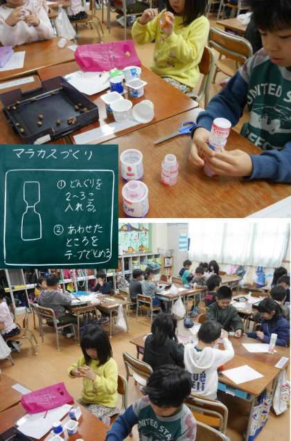 1年生が楽器マラカスを作っています。先日、鶴見緑地でひろったどんぐりを、乳酸菌飲料のケースにいれて作ります。カラカラといい音が鳴りますね。