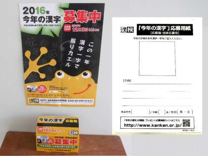 漢字検定協会が主催している「今年の世相をあらわす漢字」を募集です。全国からの応募で決まった漢字は、京都の清水寺で発表されます。ニュースでも毎年の話題となっていますね。応募用紙を6年生の教室前におきました。高学年の人は考えてみてください。