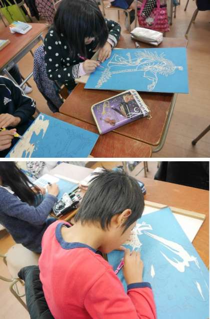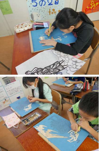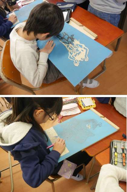 5年生の図工では、切り絵をもとに版画を彫刻刀でほり進めています。とても細かい柄に作業に集中しています。刃のむきに気をつけて安全にお願いします。
