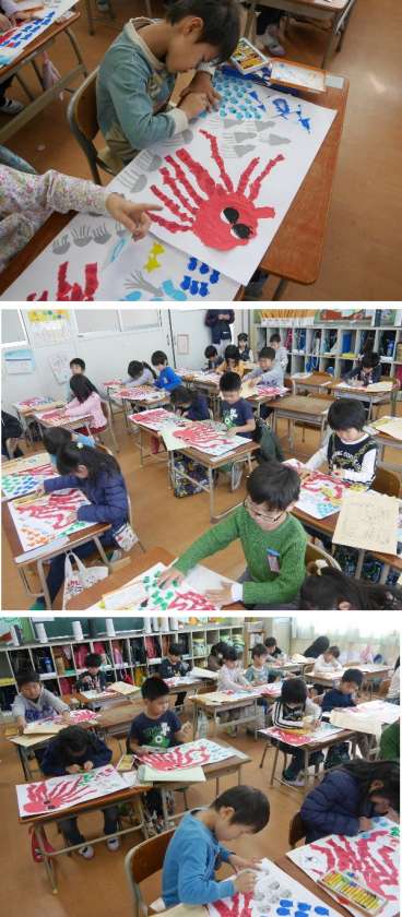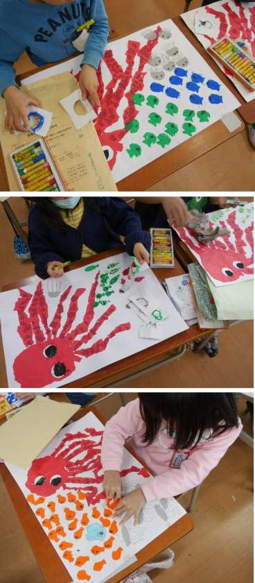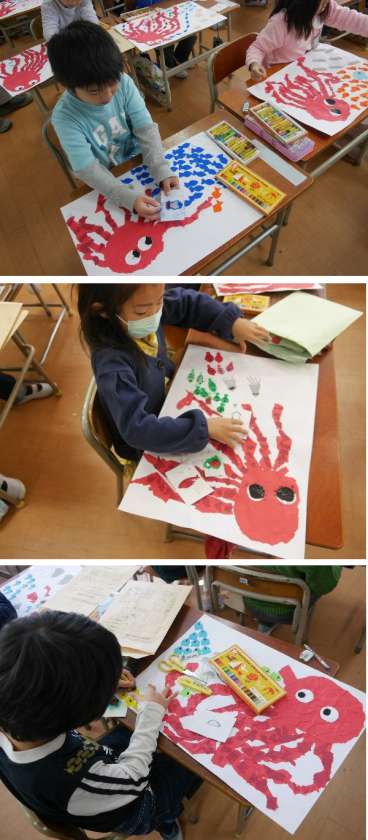 1年生が図工で、赤画用紙を手でちぎってはりつけてタコの絵をダイナミックに描いています。そこに、小魚などを型紙を使ってクレパスで塗っていきます。海の底の様子がいきいきとした絵になりました。とてもよくできていますね。