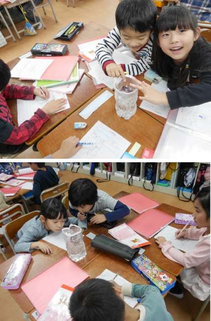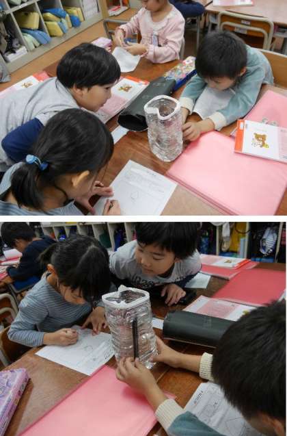 1年生がしぁしんすの生長の様子を観察して記録しています。根はのびてきましたが、まだまだ芽がのびてきませんね。