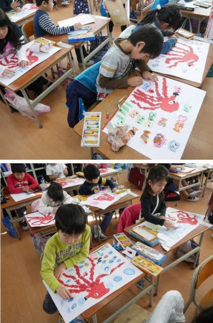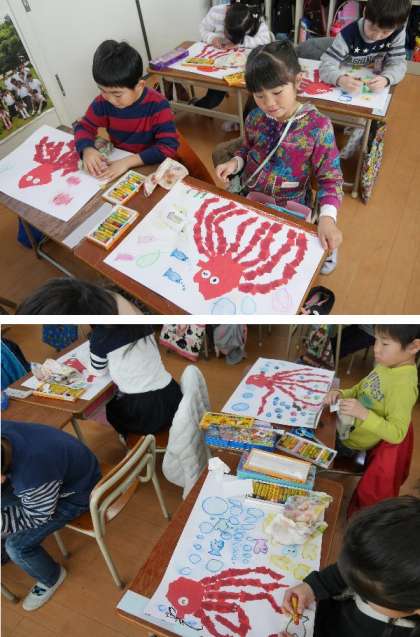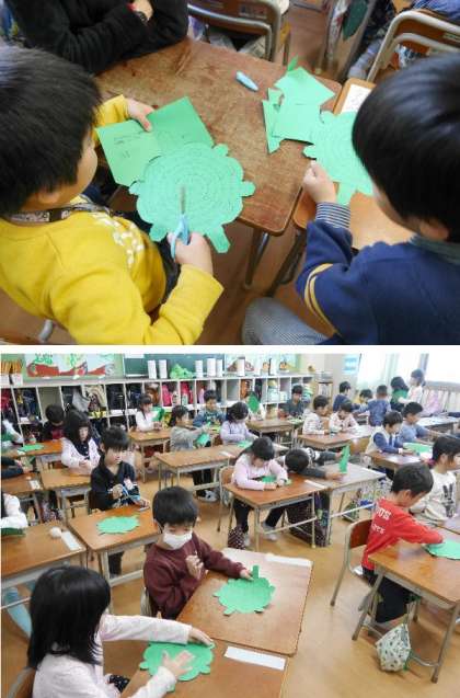 1年生も入学当初に比べると、いろいろな活動がスムーズにできるようになってきましたね。画用紙をちぎってタコをはったり、型紙を使って小魚を描いたり、ていねいな作業ができるようになりました。緑色の画用紙をハサミで複雑な線にそってきれいに切っています。これからクリスマスツリーを作るんですね。
