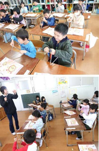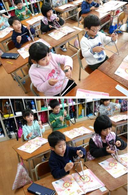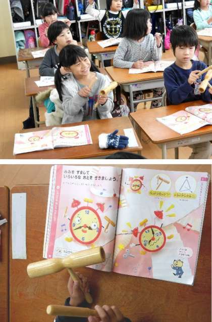 1年生がウッドブロックとトライアングルをもって、楽しそうに音楽に音を合わせています。CDの音楽をよく聞いて、ウッドブロックとトライアングルを曲にあわせて鳴らします。じょうずにあわせることができたかな?