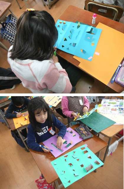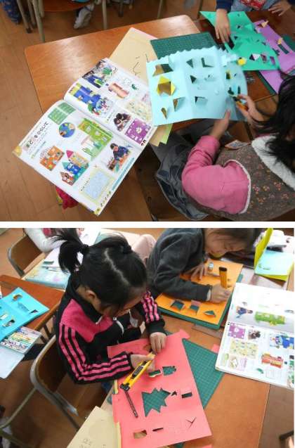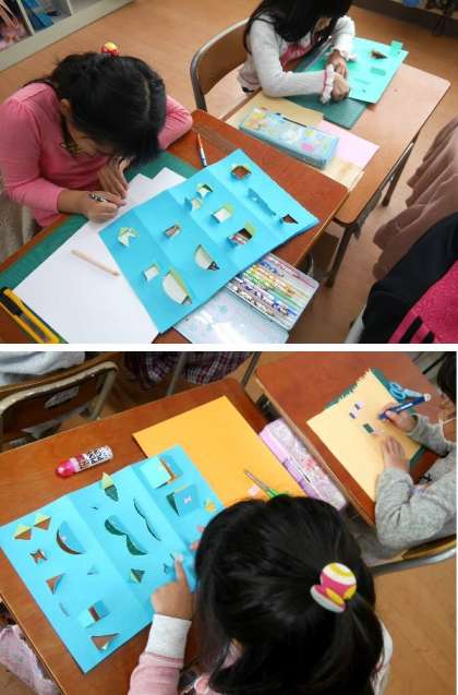 2年生か、カッターナイフを使って画用紙に窓を作っています。窓をひらくと何が見えるかな?窓があいたら絵が見えるように工夫していきます。いろんな形の窓がありますね。