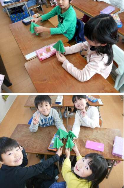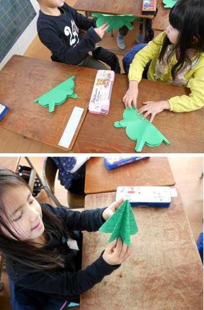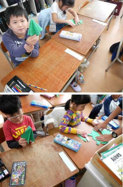 1年生が緑色の画用紙を切り抜き、線にそって山折りと谷折りを交互にして折っていくとクリスマスツリーができあがりました。なかなかむずかしかったですね。このツリーに飾りづけをしていきます。