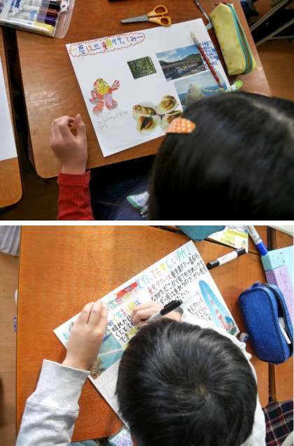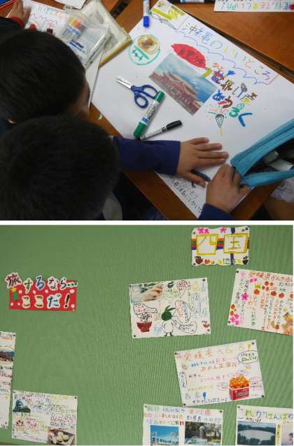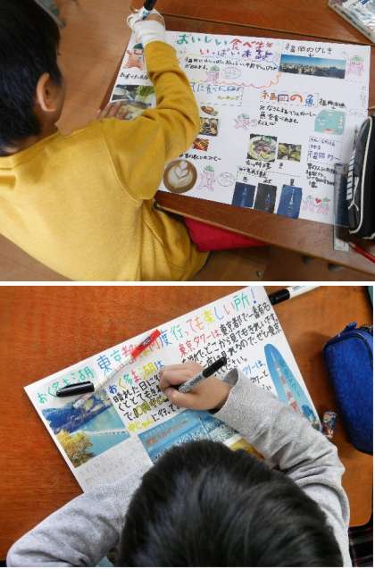 4年生はインターネットなどを使って、都道府県を分担して調べています。調べた資料をもとに都道府県の良いところを画用紙にまとめました。みんなはどこに行きたいですか?