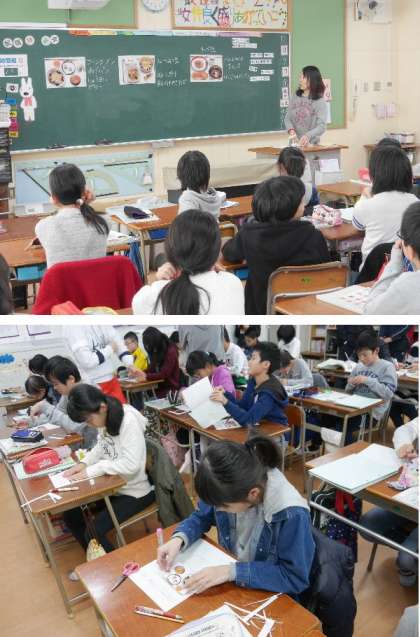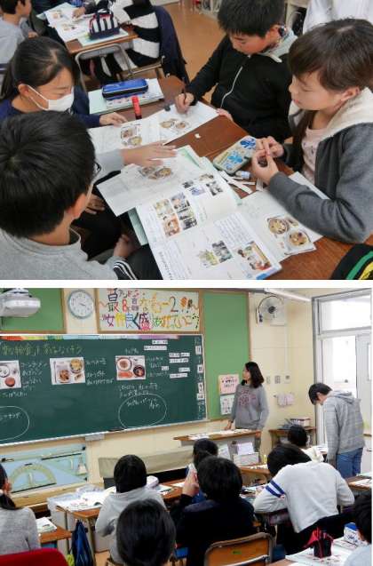 6年生で家庭科の研究授業が行われました。「1食分の献立を考えよう」と、まず、変な給食の献立をみて感じたことを話し合い、栄養バランスのとれた献立になるように考えました。