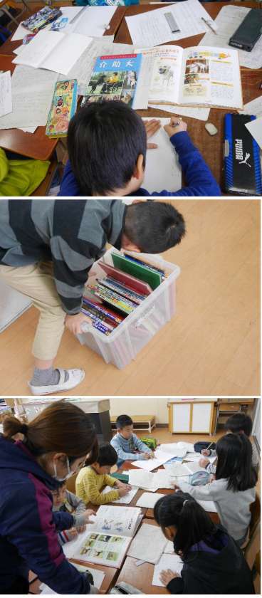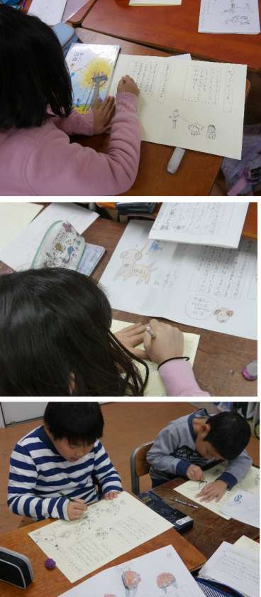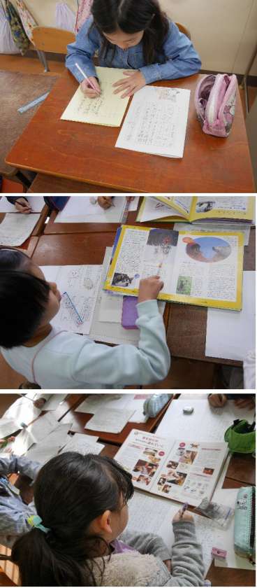 3年生では「はたらく犬」について調べています。いろいろな資料をみてがんばってまとめています。なかなか絵も上手に描けていますね。
