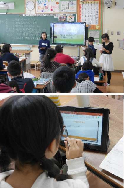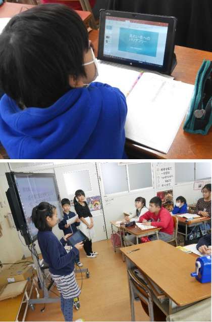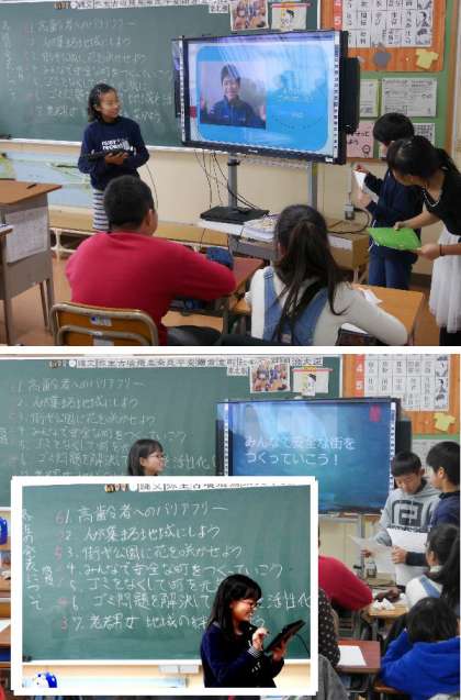 「人が集まる地域にしよう」「みんなで安全な街をつくっていこう」と、いろいろな社会問題について話し合い考えたことを、タブレットを使って発表していました。さすが6年生は機器を使いこなしていますね。