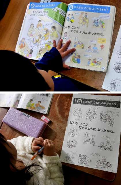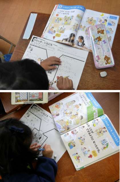 1年生の生活科の授業です。「じぶんのことをふりかえろう」と、小学校に入学してから、どんなにとができるようになったかを考えました。また、「じぶんの1日をみつめよう」では、家でどんなことをしているかを考えました。起床やそうじ、かたづけ、自分でできることが増えましたか?