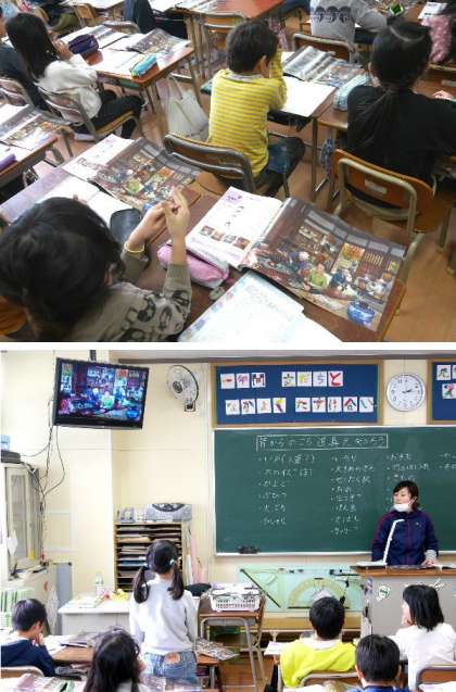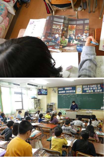 3年社会で、昔からのこる道具について、教科書のイラストをみて皆で意見を出し合っていました。