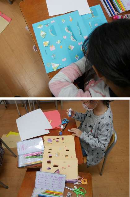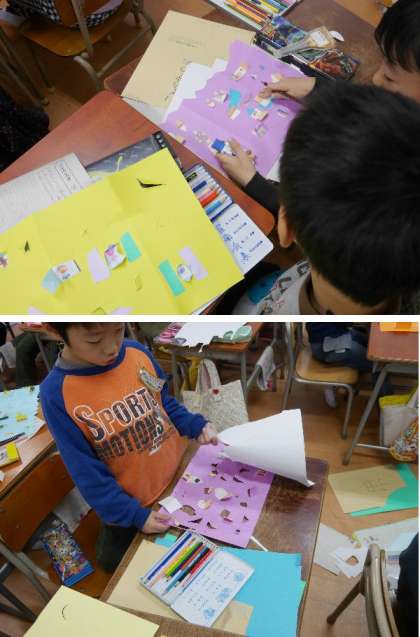 2年生では画用紙に窓をあけて、その中の絵も描いています。窓の中には何がみえるんでしょうか?いろいろな思いがみえていますね。