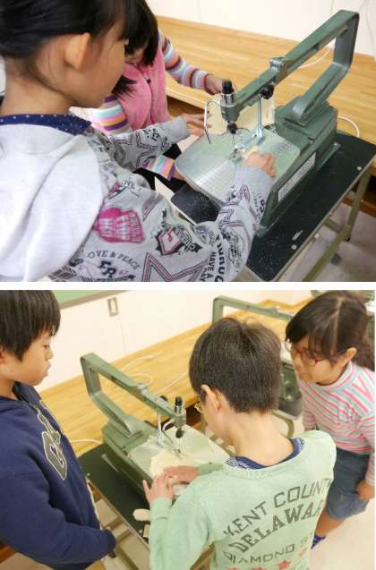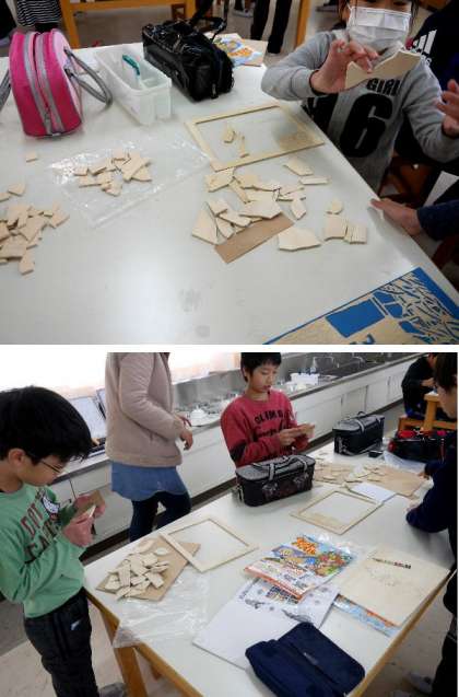 糸のこ盤を使って、絵が書かれた一枚の板をパズルできるように細かく切っています。