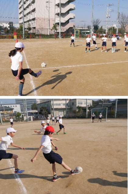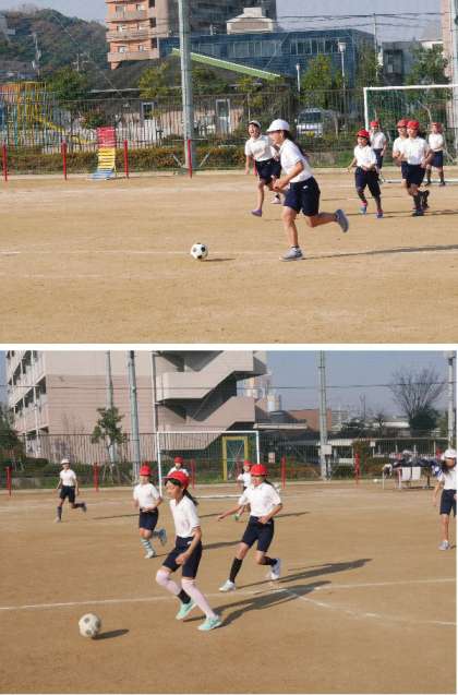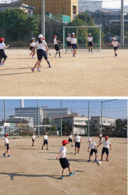 5年生の体育ではサッカーの試合を男女別でおこなっていました。運動場は日がよくあたり今日はぬくかったです。汗をかいてコートを走り回ってがんばっていました。
