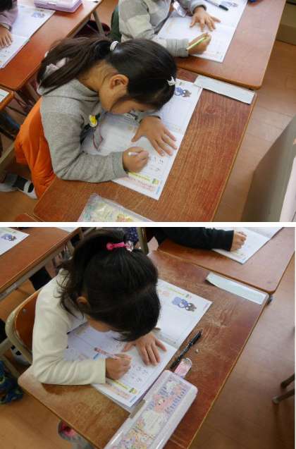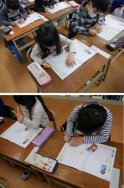 1年生が書写ノートで、年賀状のかきかた練習をしています。「あけまして おめでとう」とひらがなの練習です。これまで学習したことに気を付けながらていねいに書きましょう。