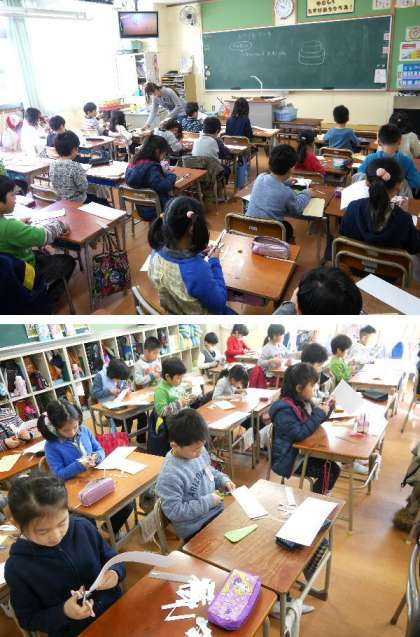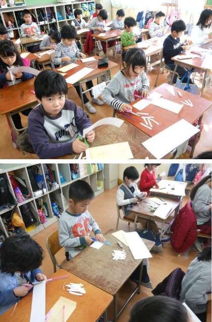 今月末の作品展にむけて、2年生が画用紙で作品づくりをはじめました。