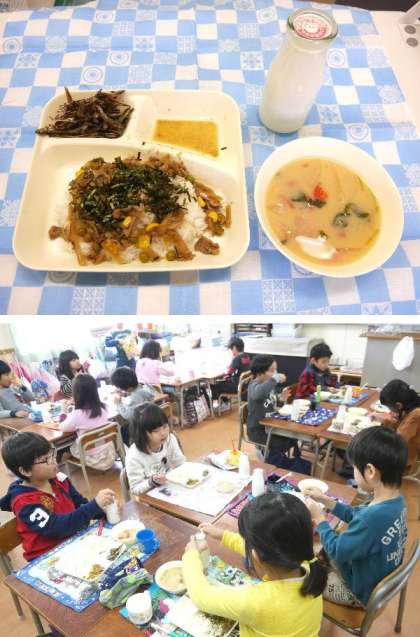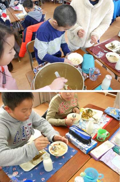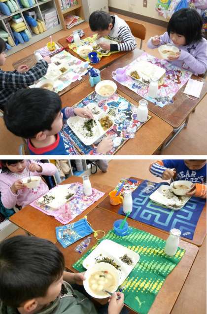 今日の給食の献立は、きんびらちらし、ぞう煮、ごまめ、牛乳でした。新年を祝う気持ちやいろいろな願いをこめたおせち料理です。ぞう煮には小餅がはいっていておいしかったですね。たくさんいただきました。