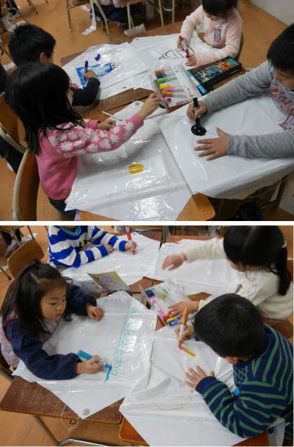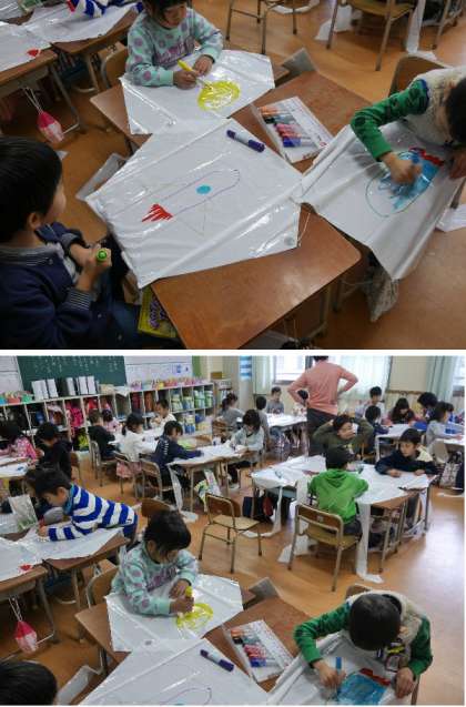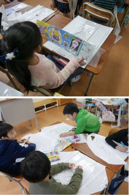 1年生は新春たこあげの凧づくりです。といっても、ビニールカイトに絵を描いていくだけです。完成したら皆で運動場でとばします。どれだけあがるか楽しみですね。