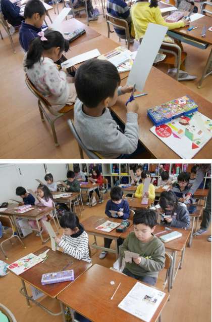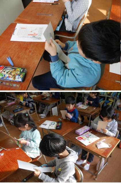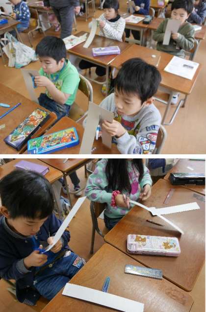 1年生が厚紙をはさみでまっすぐに切っています。風車を作っているそうです。凧あげのときに一緒にまわして遊ぶそうです。うまく作れるかな?