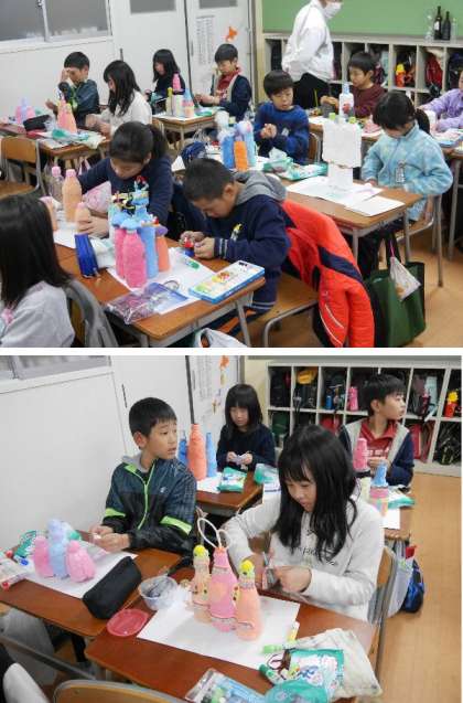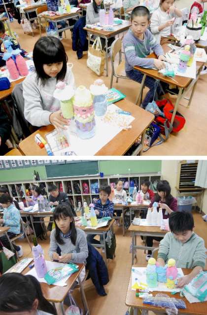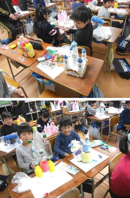 4年生は、ビンをボンドでくっつけて、紙ねんどをはって作品を作っています。だんだんその形があらわれてきました。お城を作っていたんです。