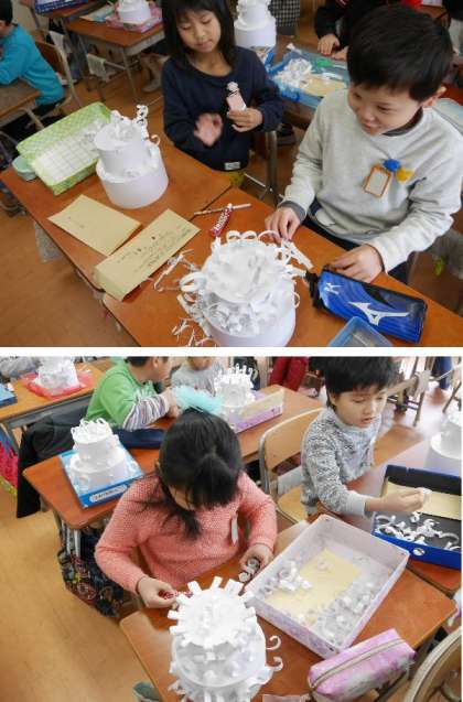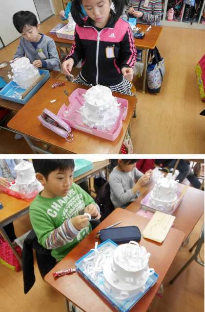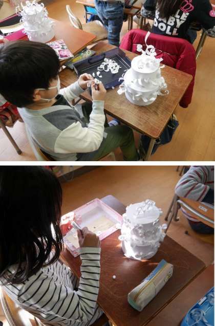 2年生の作品は、ホワイトケーキです。画用紙を上手に加工してはっていきます。細かい作業に皆が集中しています。