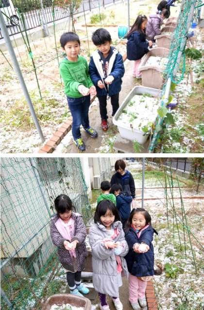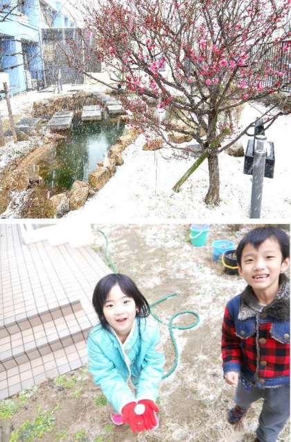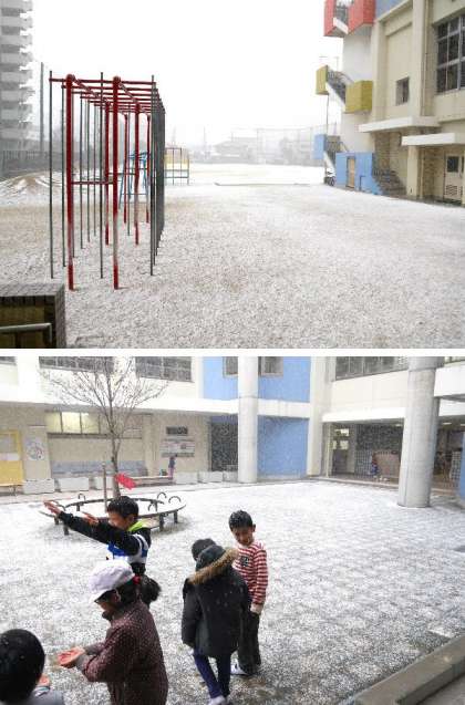 今日はとても寒いですね。お昼に急に大雪がふってきました。校舎や運動場が真っ白に雪景色です。1年生の子どもたちも雪を集めて楽しんでいました。