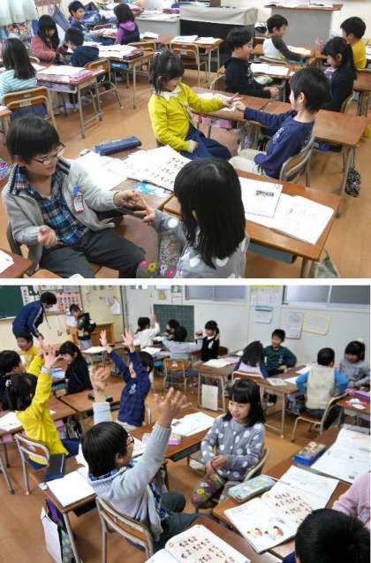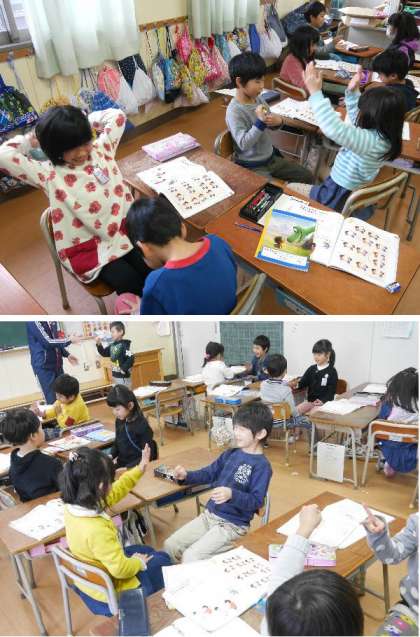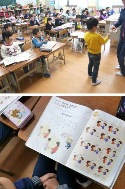 1年生の音楽では、わらべうたを歌った楽しんでいます。「おちゃらか ほい」とても懐かしいですね。皆が知っている歌ですね。勝ったときのポーズ、負けたときのポーズ、間違えずに楽しんでできたかな。