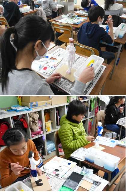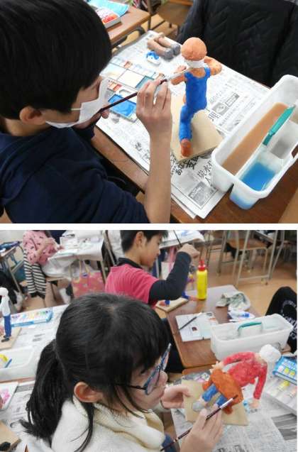 6年生の作品の仕上げをしています。将来の自分の姿をかたちにあらわしています。色あざやかに塗られて夢がかたちとしてみえてきましたね。