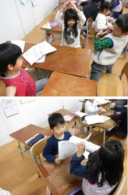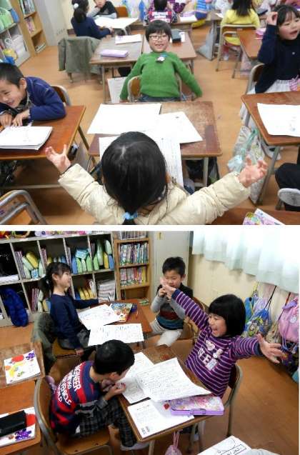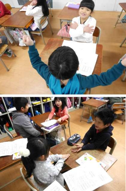 1年生の国語では、新しいじゃんけんを考えて、友だちに説明して、一緒に遊んで楽しみます。まずは、近くの友だちと自分の考えたじゃんけんをして、一緒に遊びました。とっても楽しそうです。いろんなポーズがあっていい顔していますね。