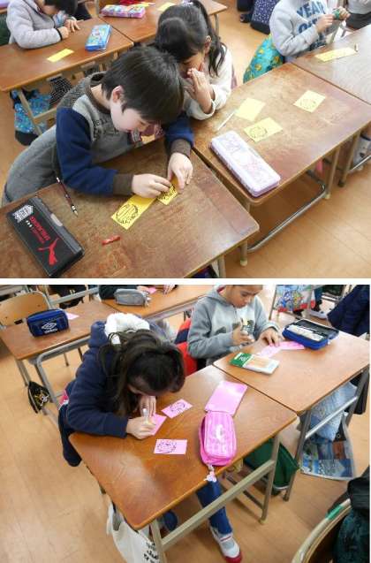 6年生の卒業お祝いの会が3月に行われます。たて割り班では、リーダとして6年生にお世話になりましたね。1年〜5年生がお世話になった6年生のメッセージカードを書いています。