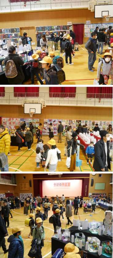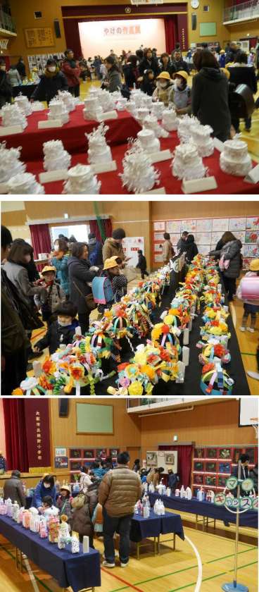 3時間の授業後には、作品展を子どもと一緒にみようとたくさんの保護者の方にきていただきました。子ども達も一緒にみてもらってとてもうれしそうです。ありがとうございました。